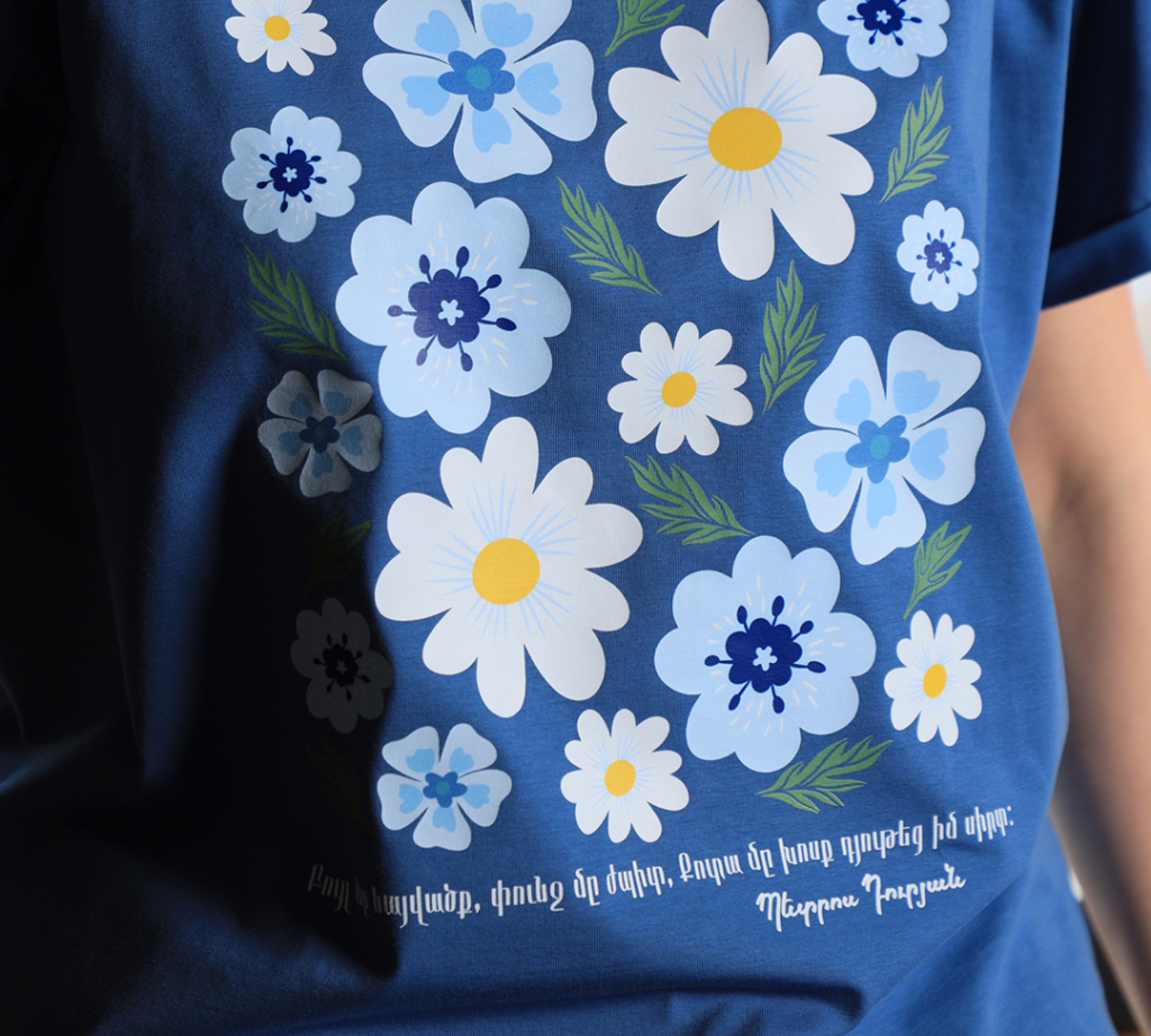 `Flower of Love` Light Blue T-shirt This T-shirt stands out with its romantic design, combining the delicate daisy print and an excerpt from Petros Duryan’s poem `To Love,` featuring the well-known lines: `A glance, a bouquet of smiles, A word enchanted my heart...` These beautiful lines express the subtlety of love and the emotional connection it creates. The T-shirt harmonizes perfectly with the blue and yellow shirts for younger age groups, making it possible to create a mother-daughter combination or a lovely match for two sisters, filling every moment with warmth and affection.