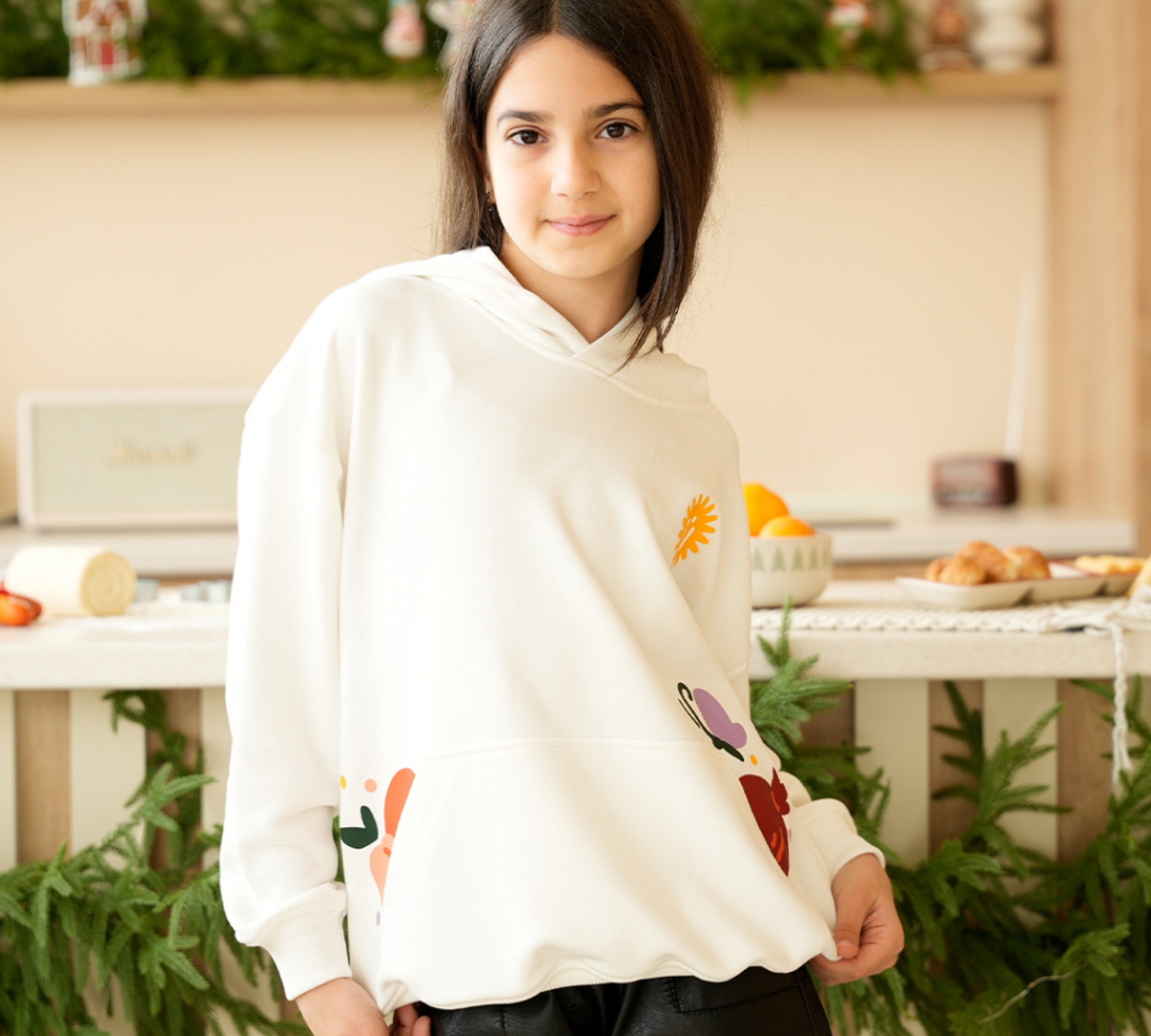 The #kidsrich collection's Fruits Hoodie instantly lifts your mood with its bright color and cheerful print. It exudes warmth, just like the campaign's main message. It will become a beautiful part of a family set and is a great solution for photos.