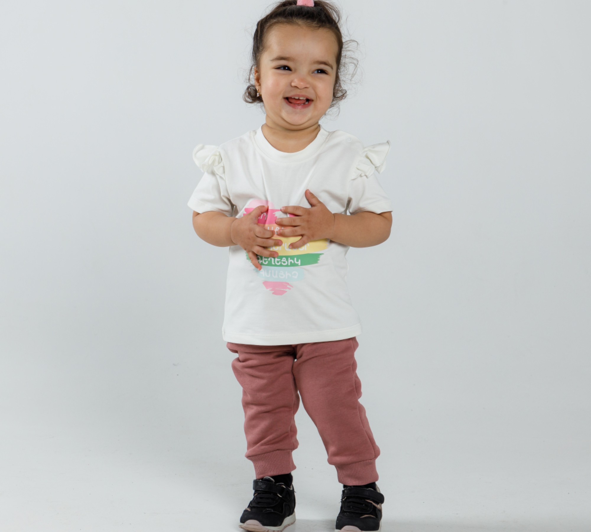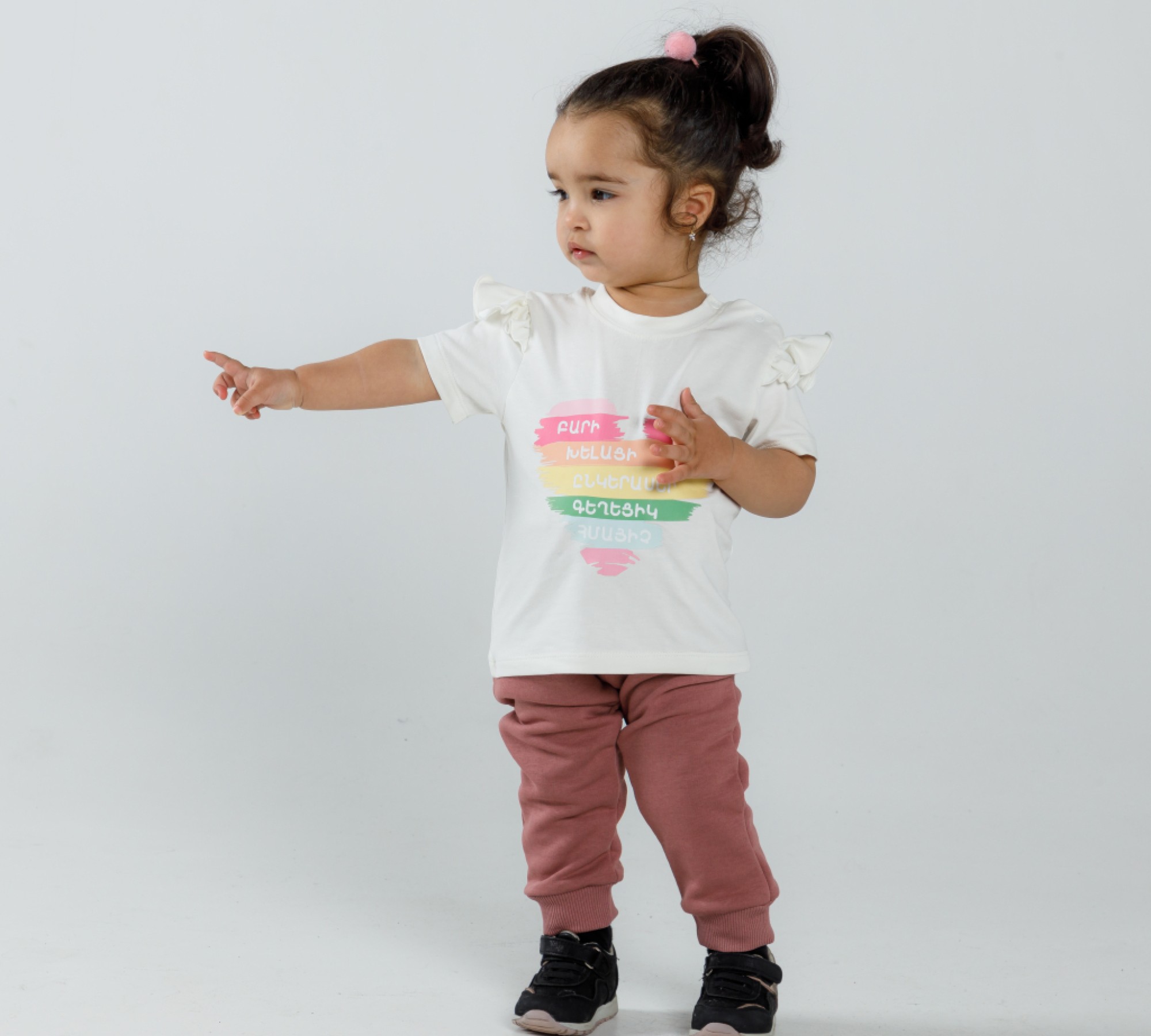 In this delicate milk-colored T-shirt with short sleeves, buttons on the shoulder and a heart print with different warm inscriptions your little girl in warm weather will be the most stylish and beautiful