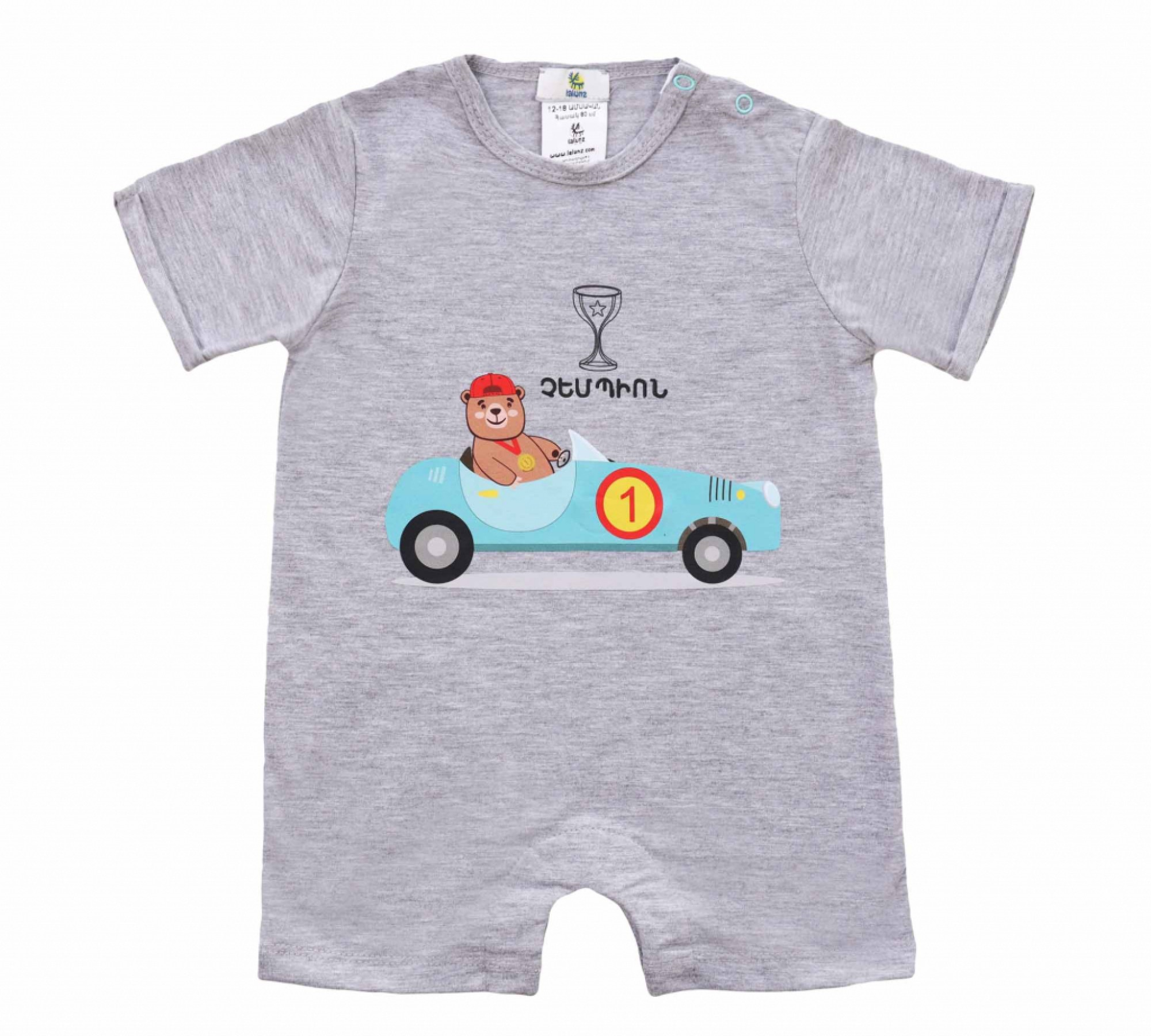 gray short-sleeved jumpsuit with champion Gosh bear print