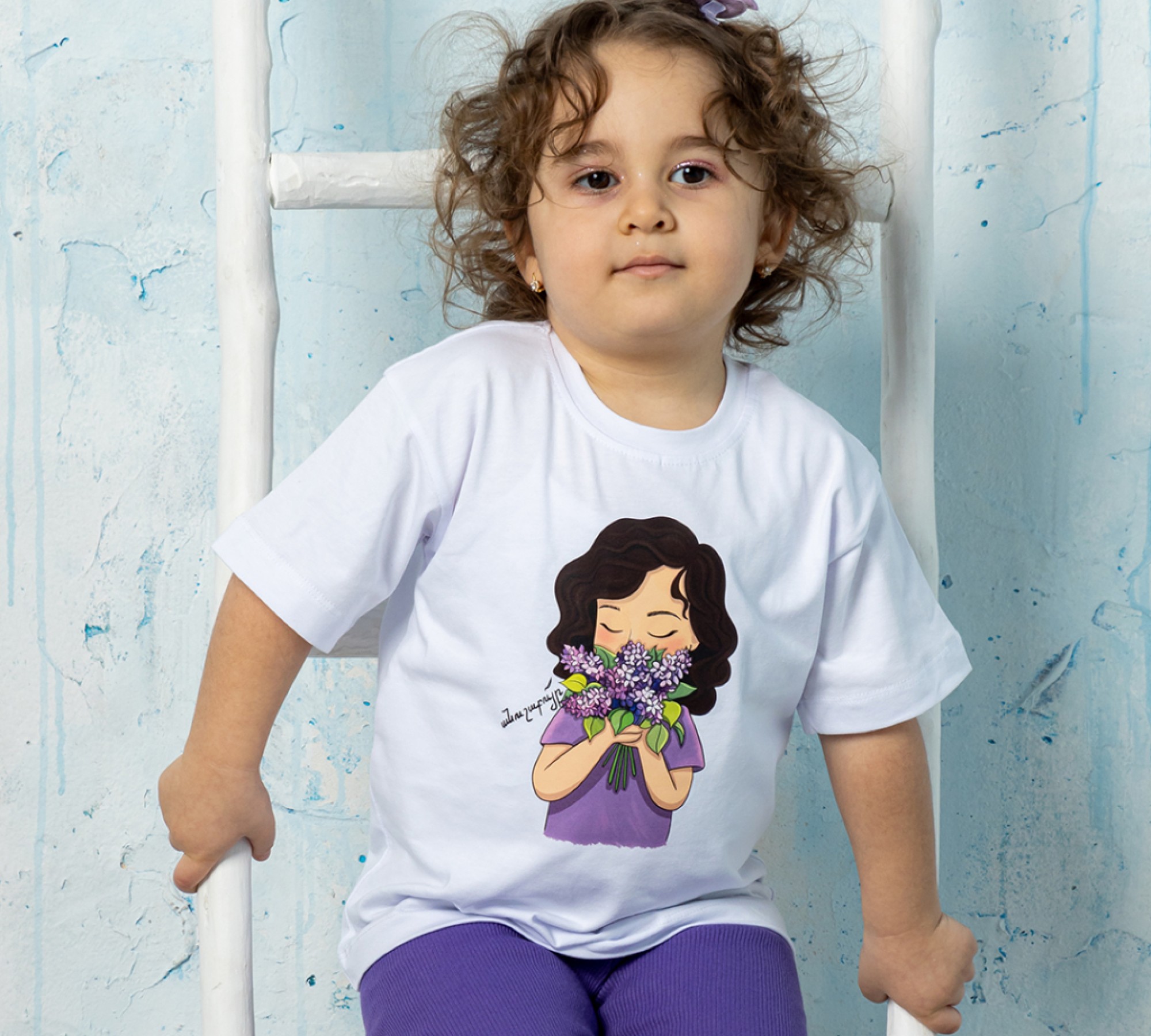 This white short-sleeved Tshirt featuring our lilac-loving beauty pairs perfectly with sporty and classic pants, skirts, jeans and will become your little girl\'s favorite piece of clothing. Did you smell the scent of lilacs too?