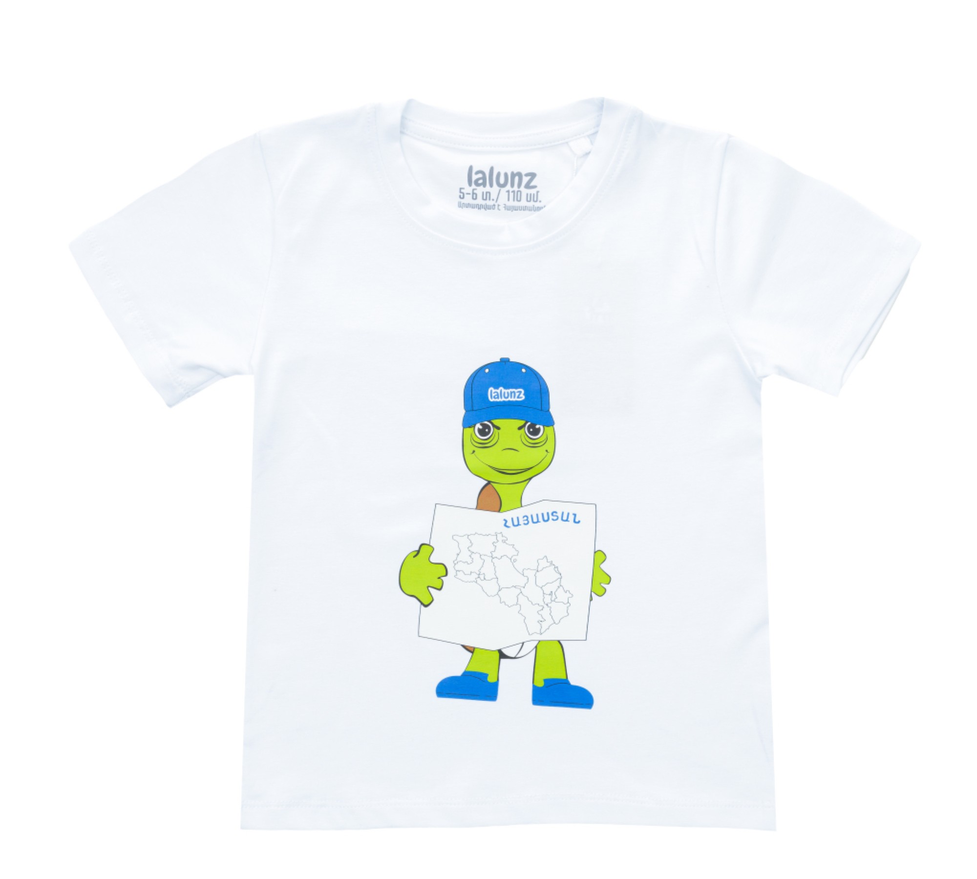 White short-sleeved t-shirt with turtle patriot print with map of Armenia