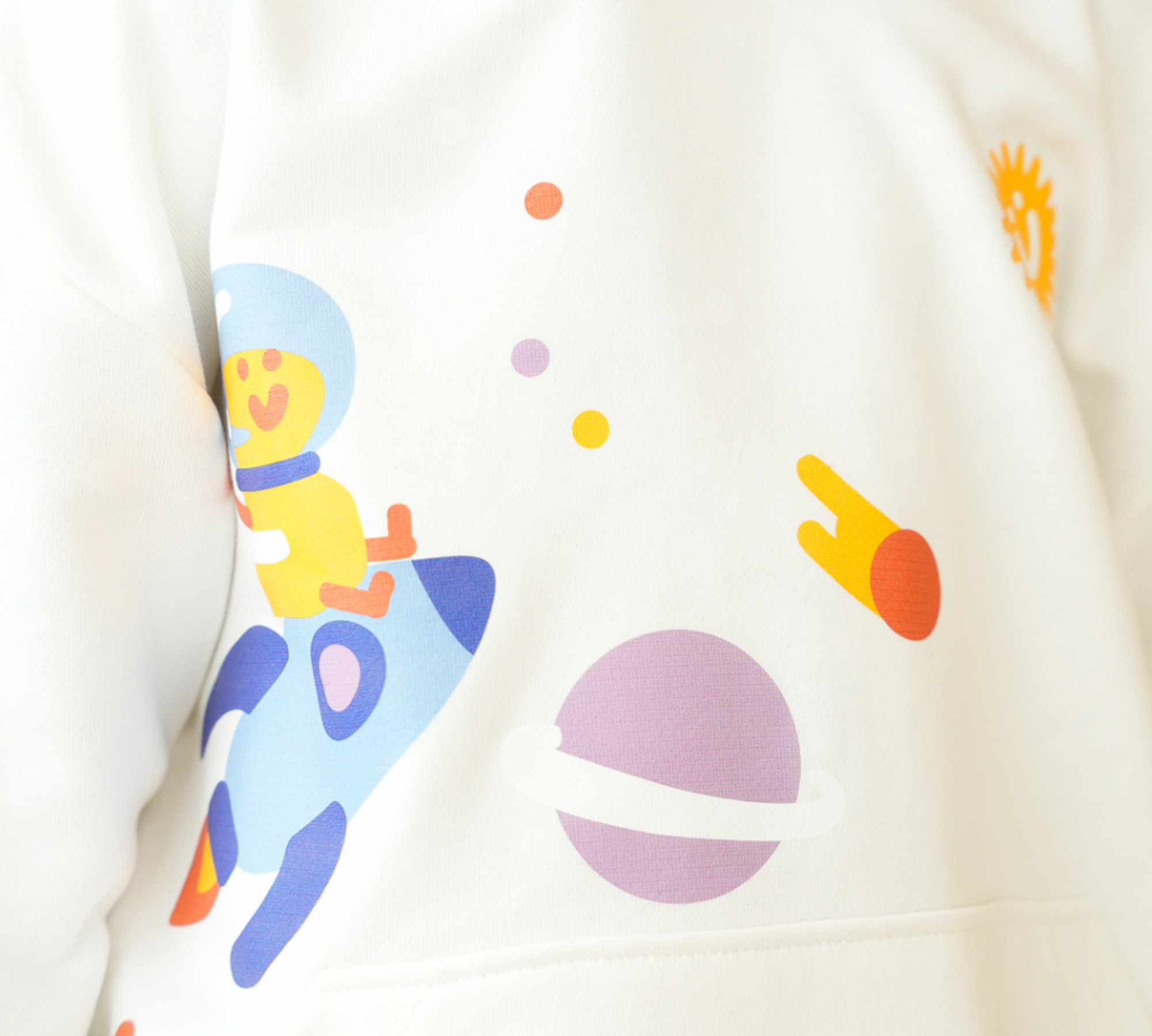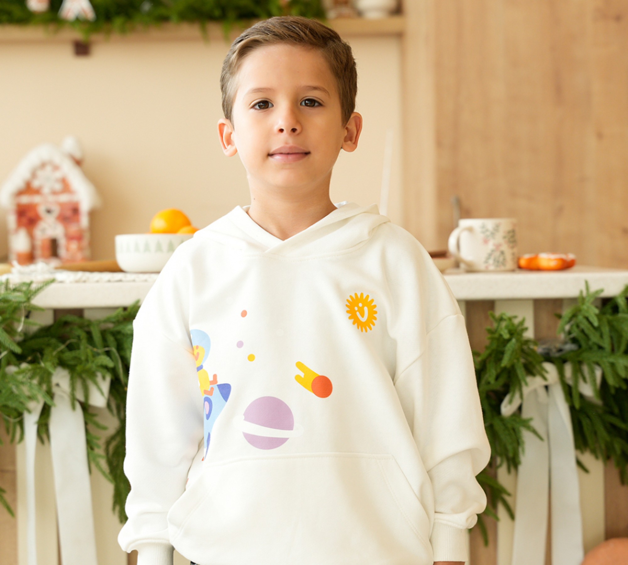 The astronaut hoodie from the #kidslovecollection instantly lifts the mood with its bright color and cheerful print. It gives warmth, like the main message of the campaign. It will become a beautiful part of the family set and is a great solution for photos.