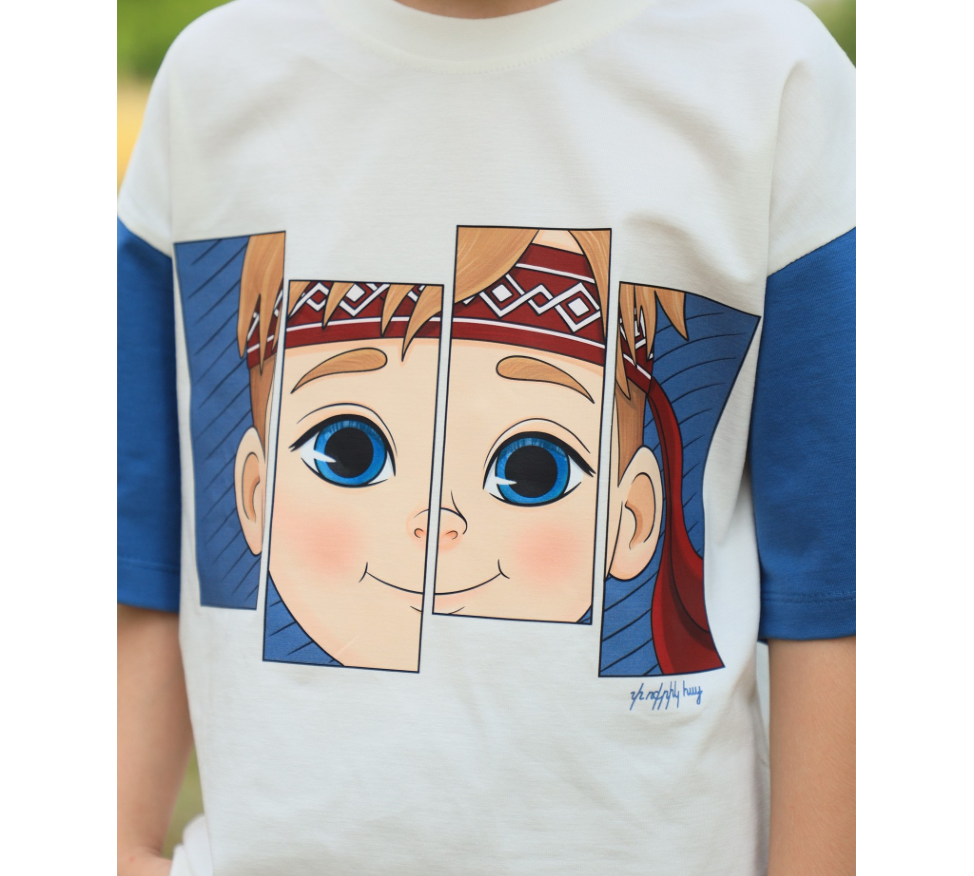 A milk-colored kids’ t-shirt with sky blue sleeves, inspired by subtle elements of Armenian traditional style. Made from soft, breathable fabric for ages 2–6.