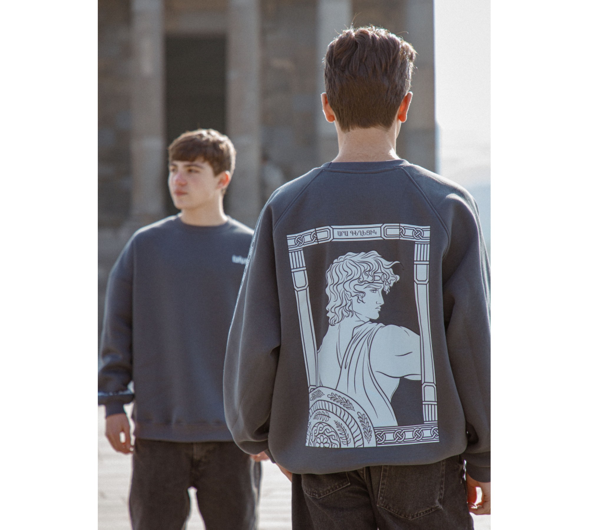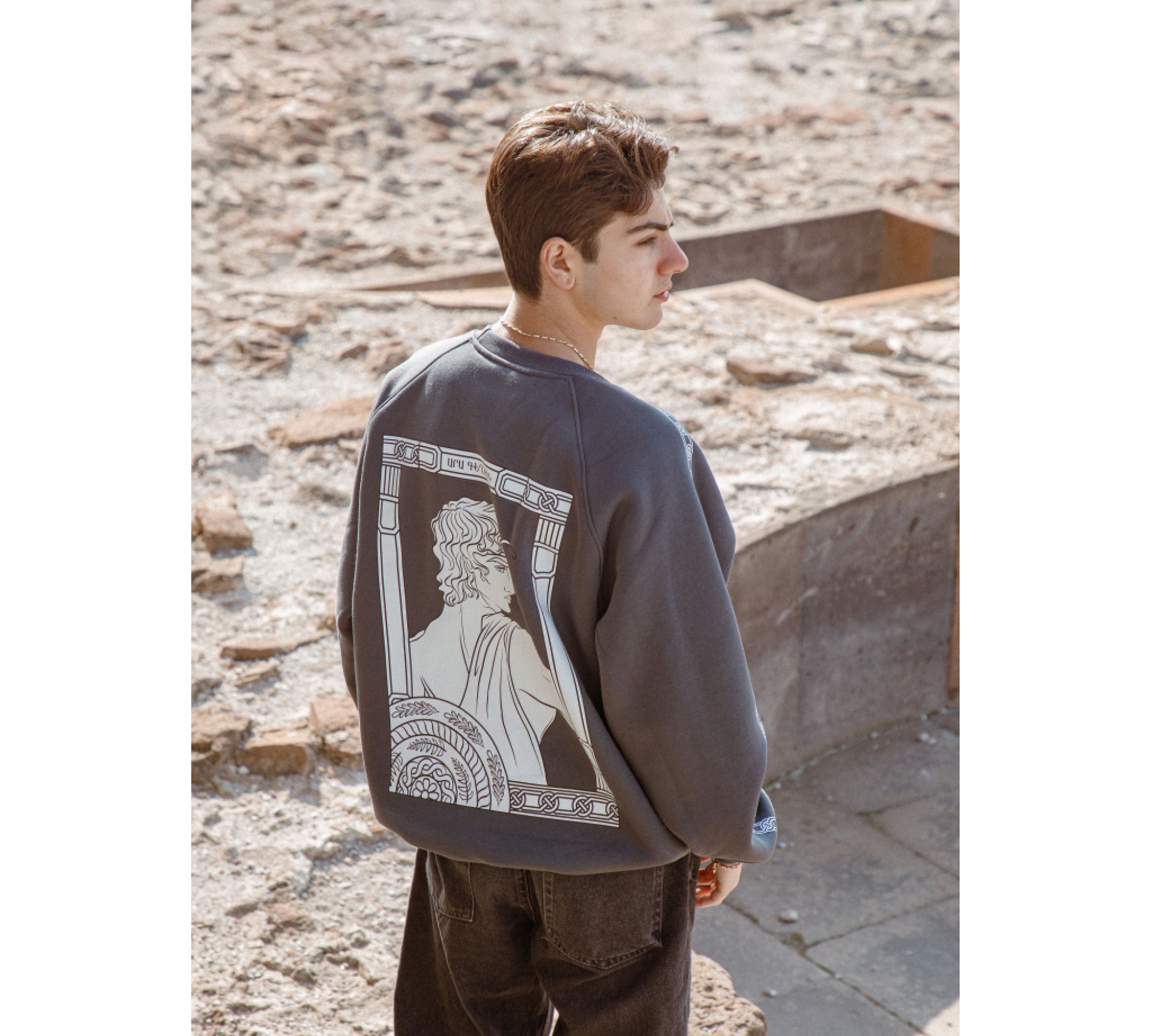 `Aram Geghetsik` loose-style sweater in gray, made from high-quality knit fabric. Suitable for both boys and girls, thanks to its unique and one-of-a-kind design.