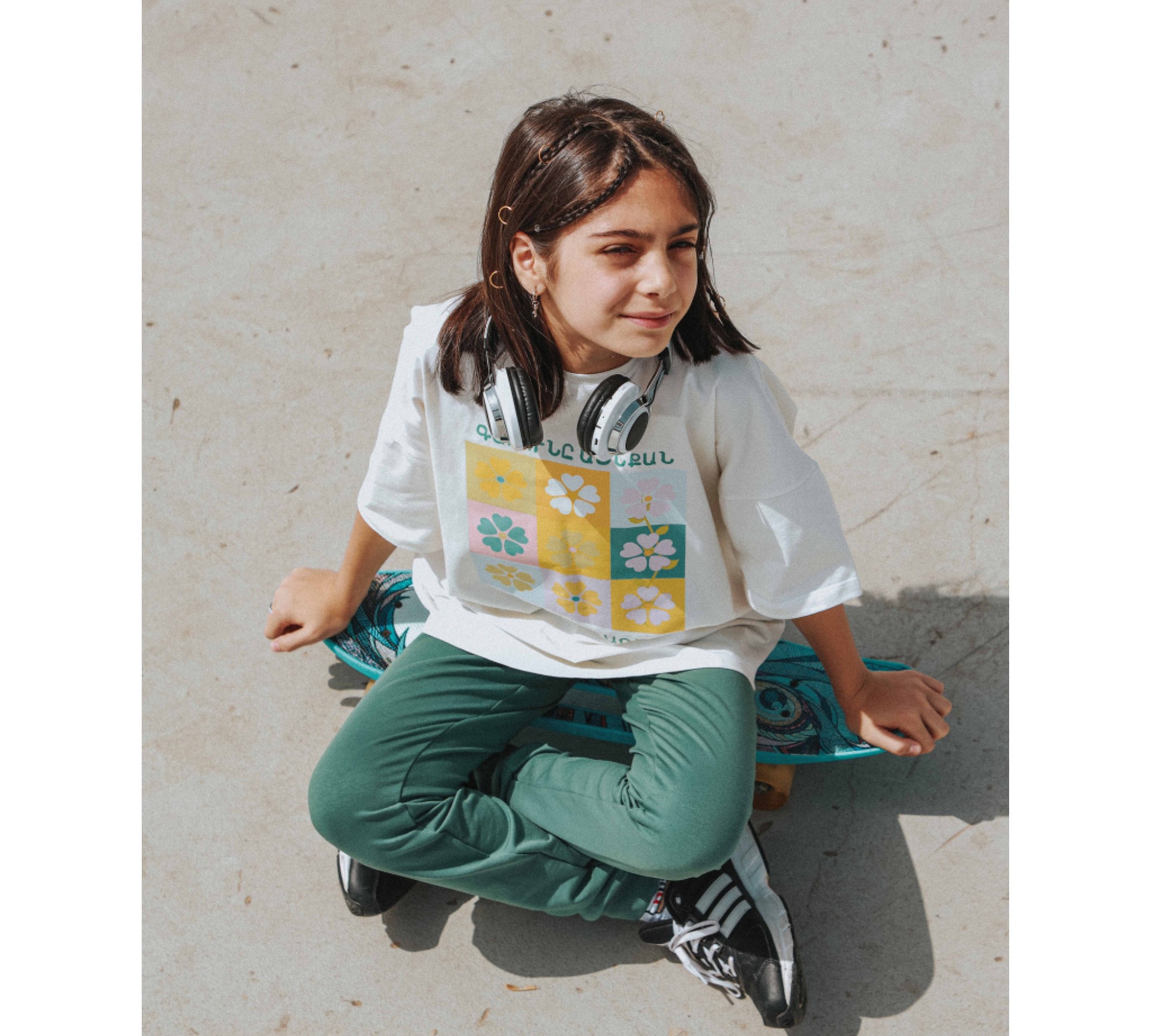 Стильная, удобная и качественная футболка с короткими рукавами молочного цвета с ярким цветочным принтом и надписью \`Весна зажгла столько цветов\` для ярких девушек