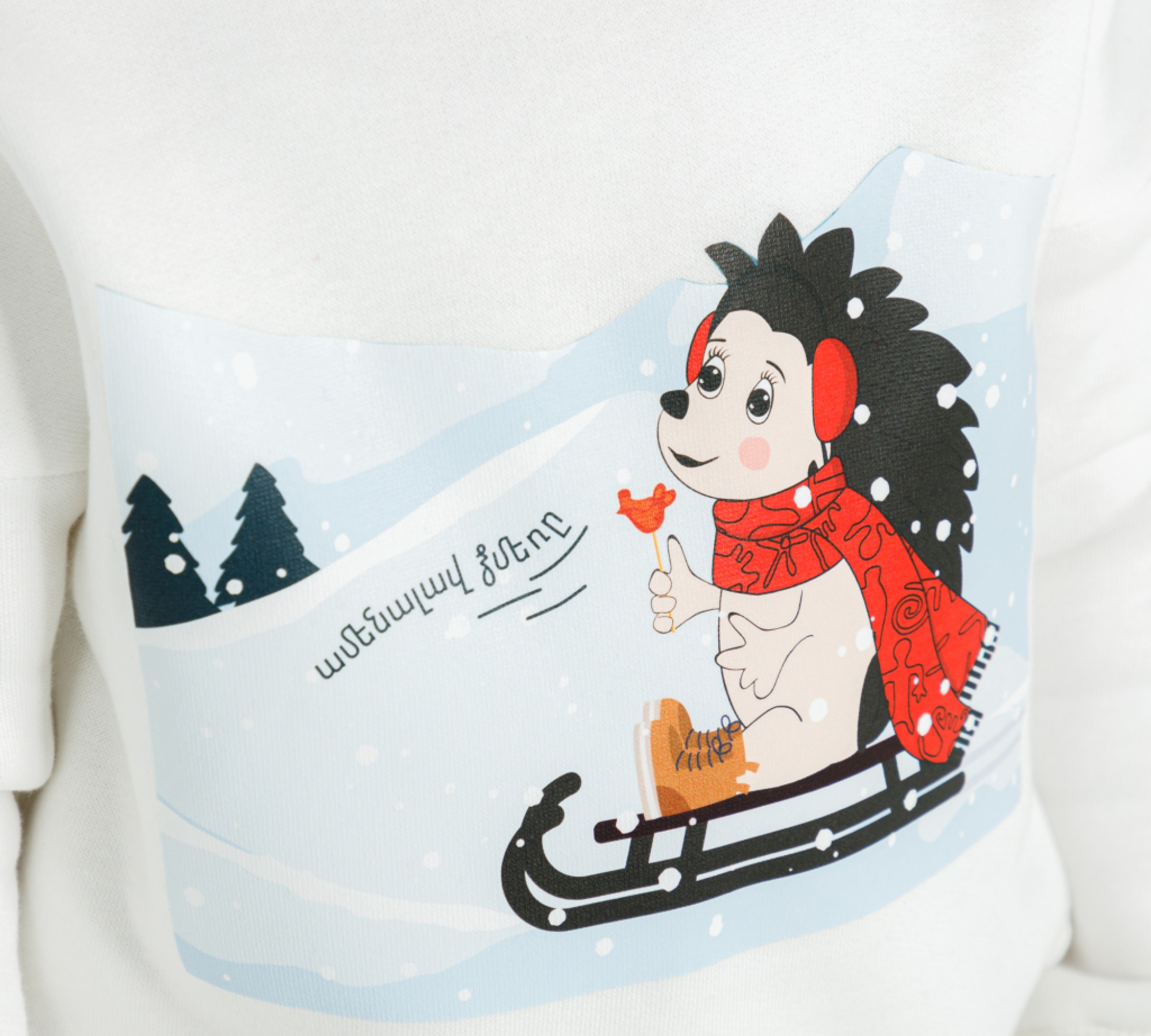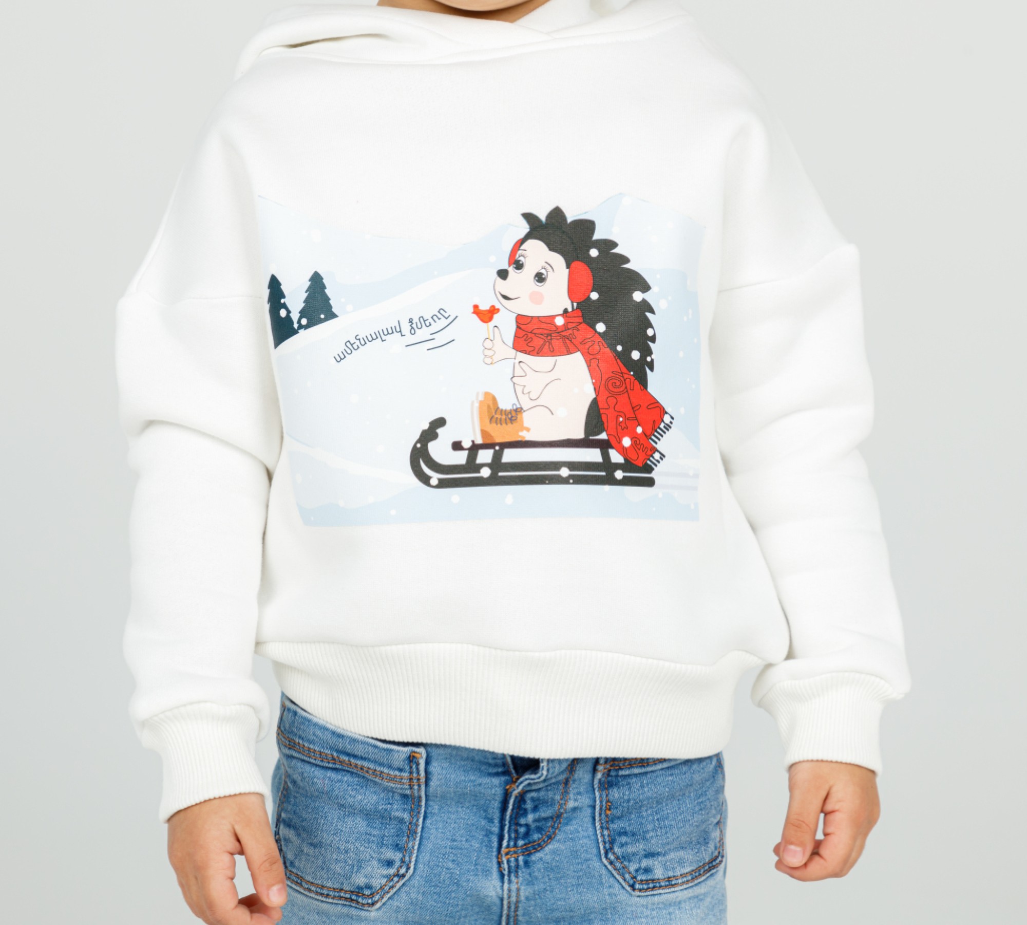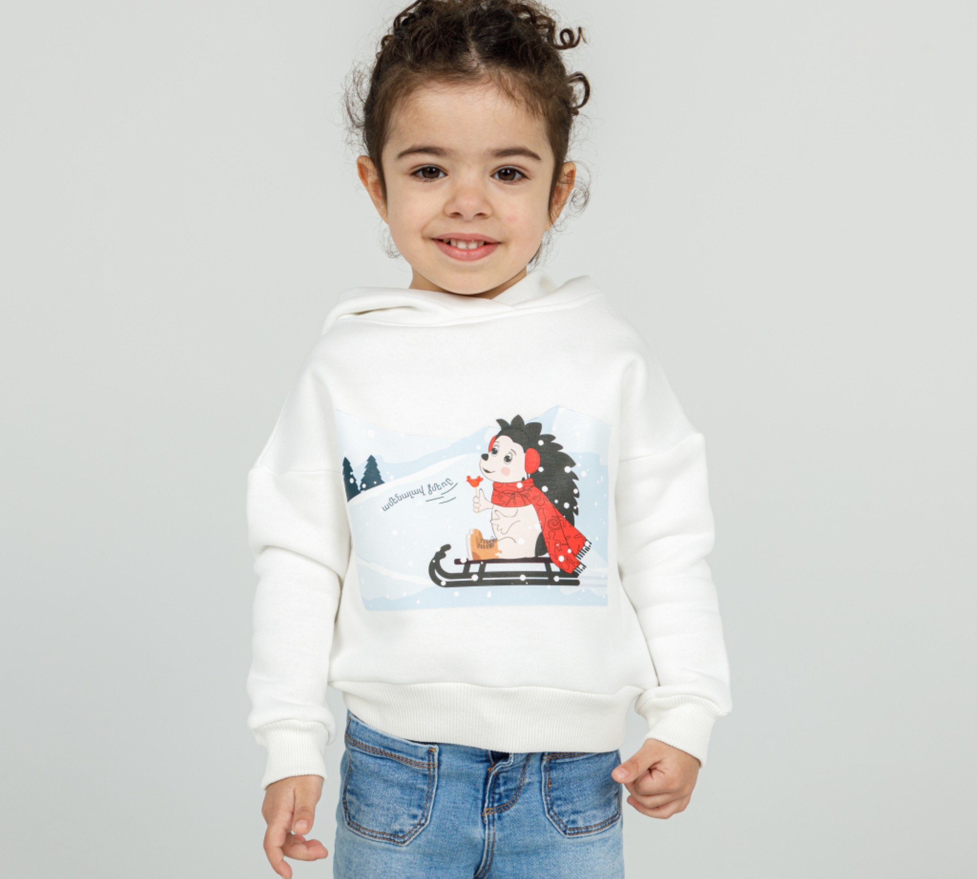 Качественные, стильные и удобные худи молочного цвета цвета с принтом наслаждающегося зимой ёжика Лала для маленьких девочек