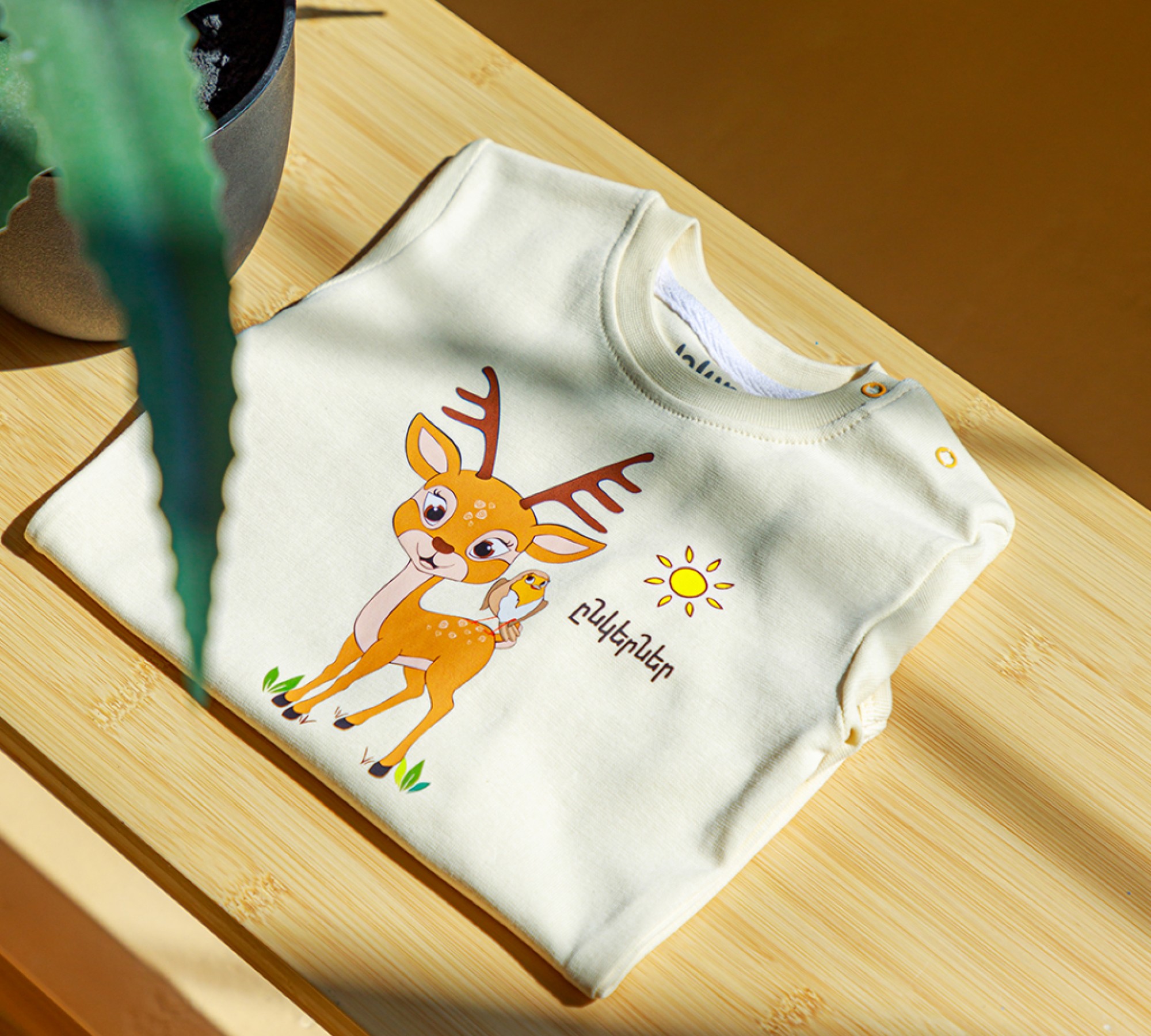 This long-sleeved, cream-colored bodysuit features a warm and friendly design with a cheerful depiction of a deer and a small bird.. It is designed for little ones, providing a warm and gentle feeling during play and fun.