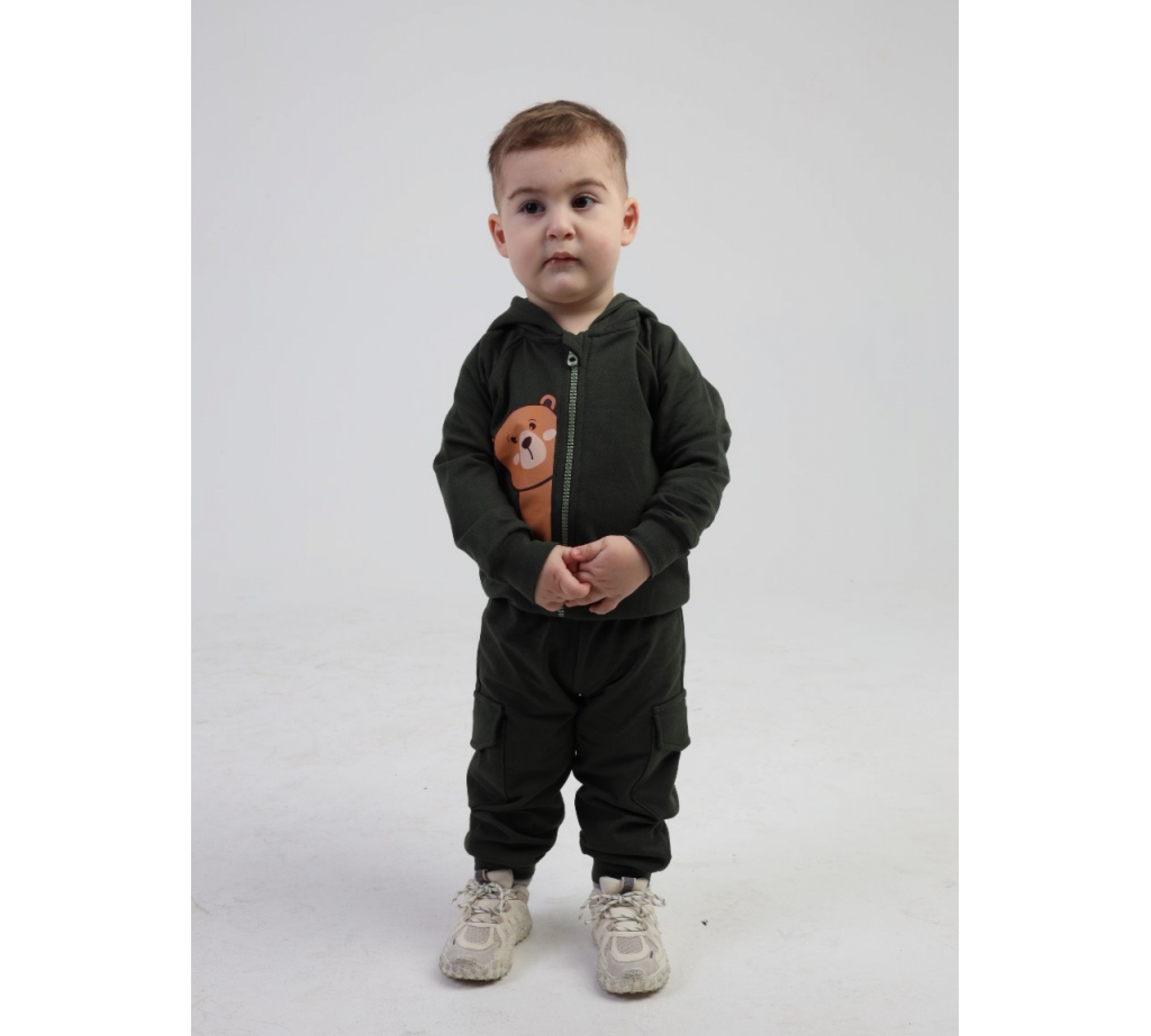The khaki green jacket with Gosh bear print with hood and zip will become the favorite and most comfortable piece in your baby\'s closet. Pairing it with matching sporty pants, you will get the perfect stylish outfit for your little one.