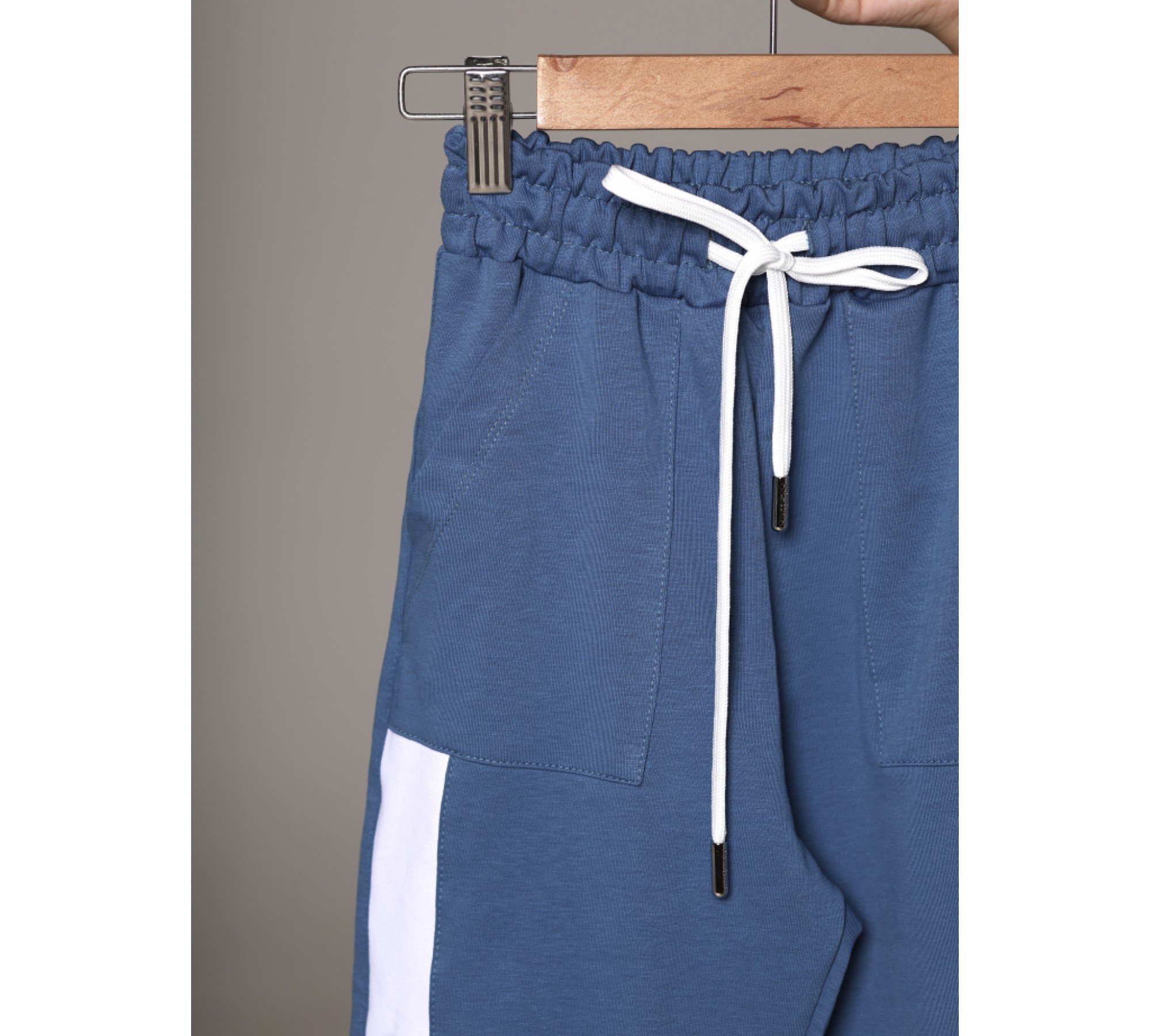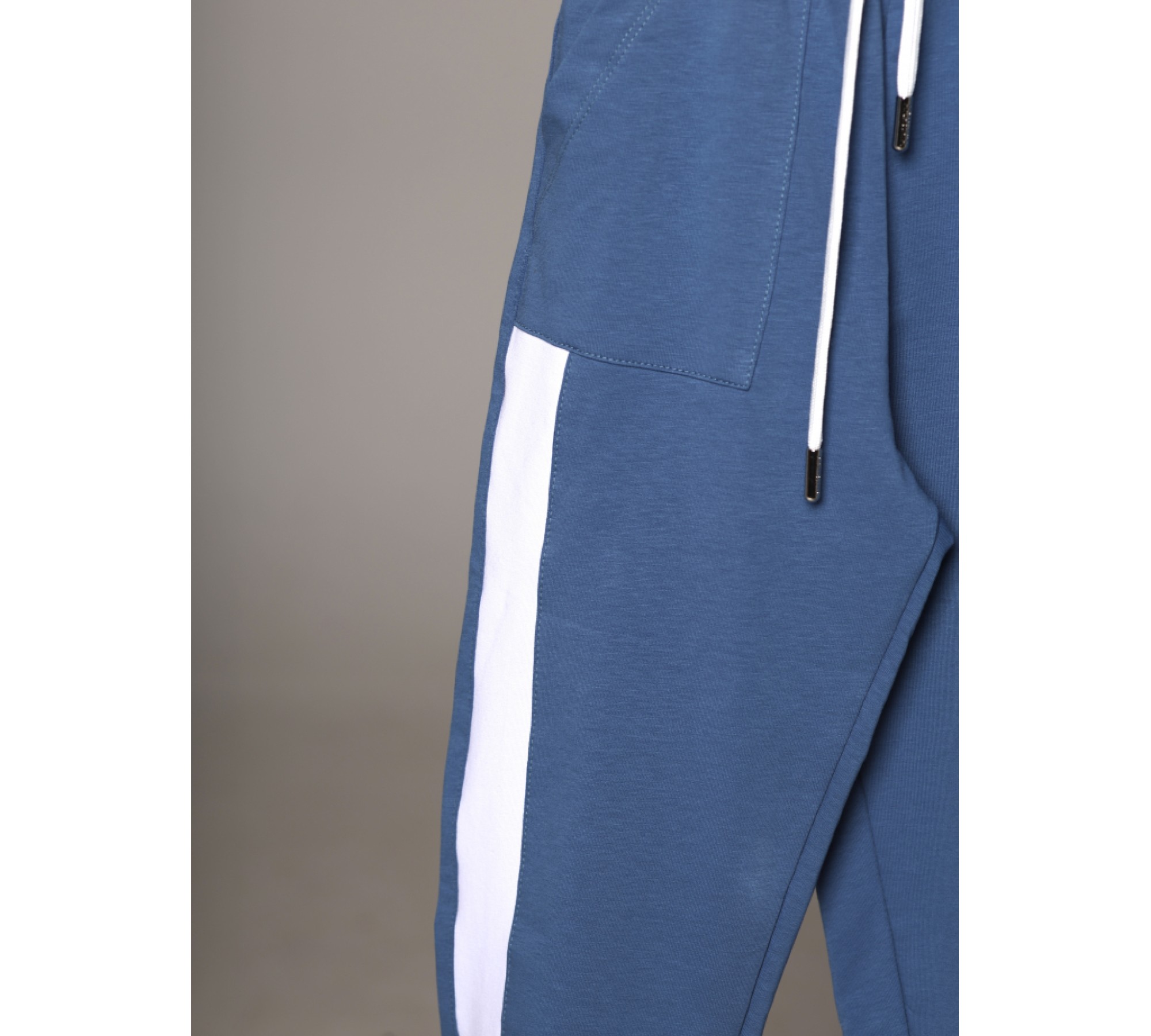 Stylish, comfortable, and high-quality blue sports pants with a white side stripe for boys.