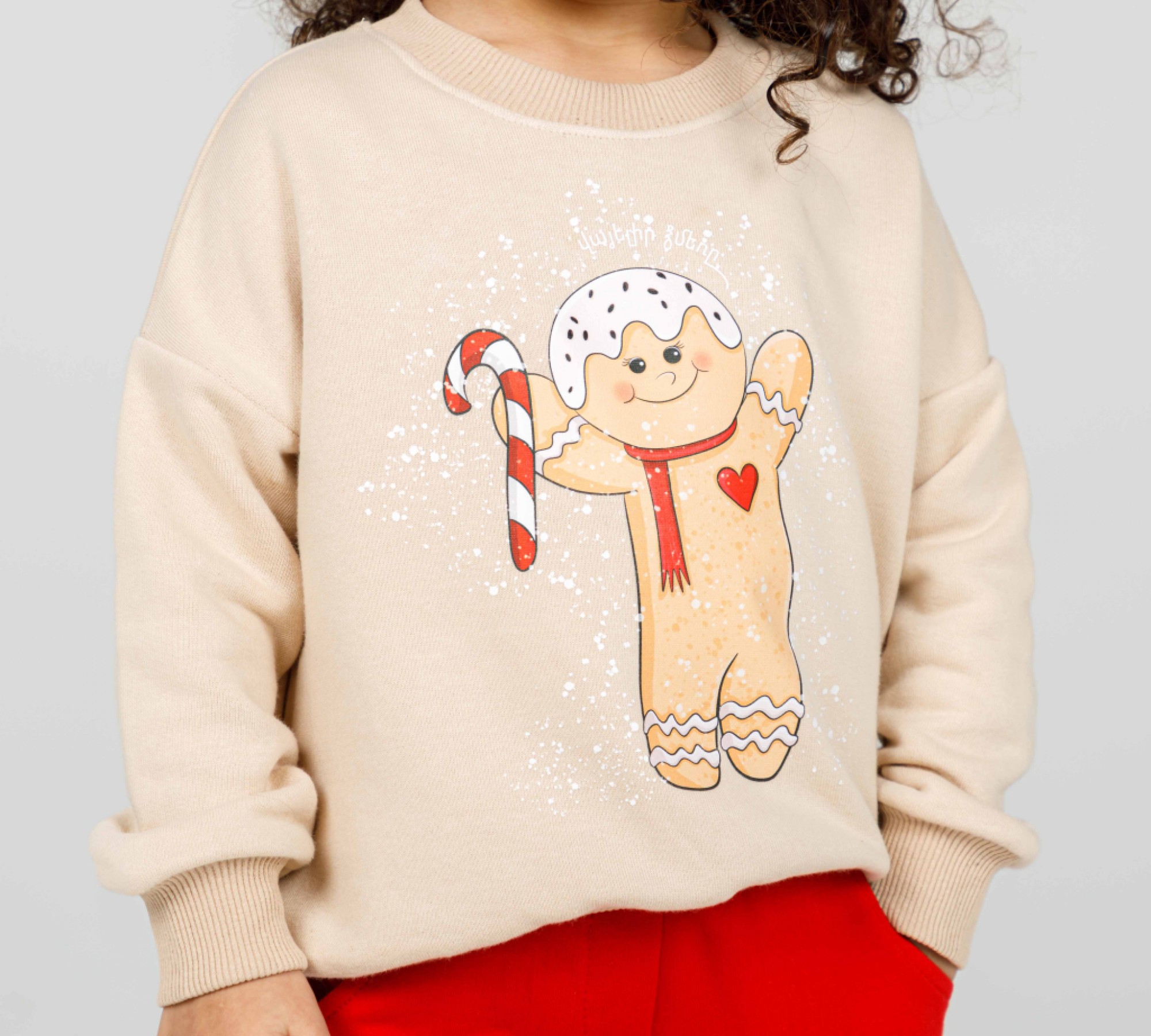 Стильный, качественный и удобный бежевый свитшот с принтом печенья, наслаждающегося зимой, для маленьких девочек