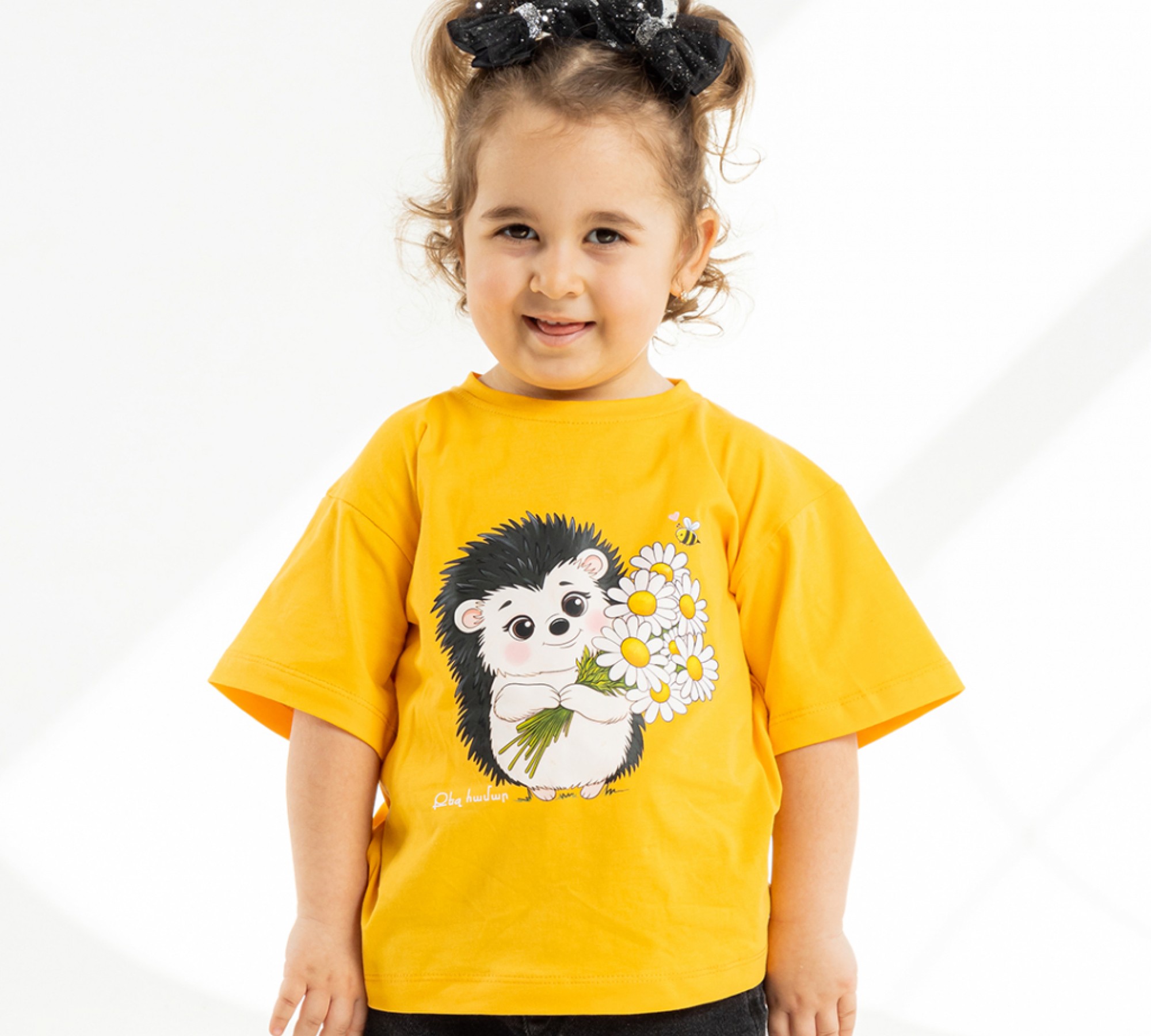 Яркая, красочная и удобная футболка с коротким рукавом с принтом ежика Ляли и весенних цветов. Футболка рассчитана на девочек в возрасте от 2 до 6 лет. Отлично сочетается с джинсами и весенними леггинсами.