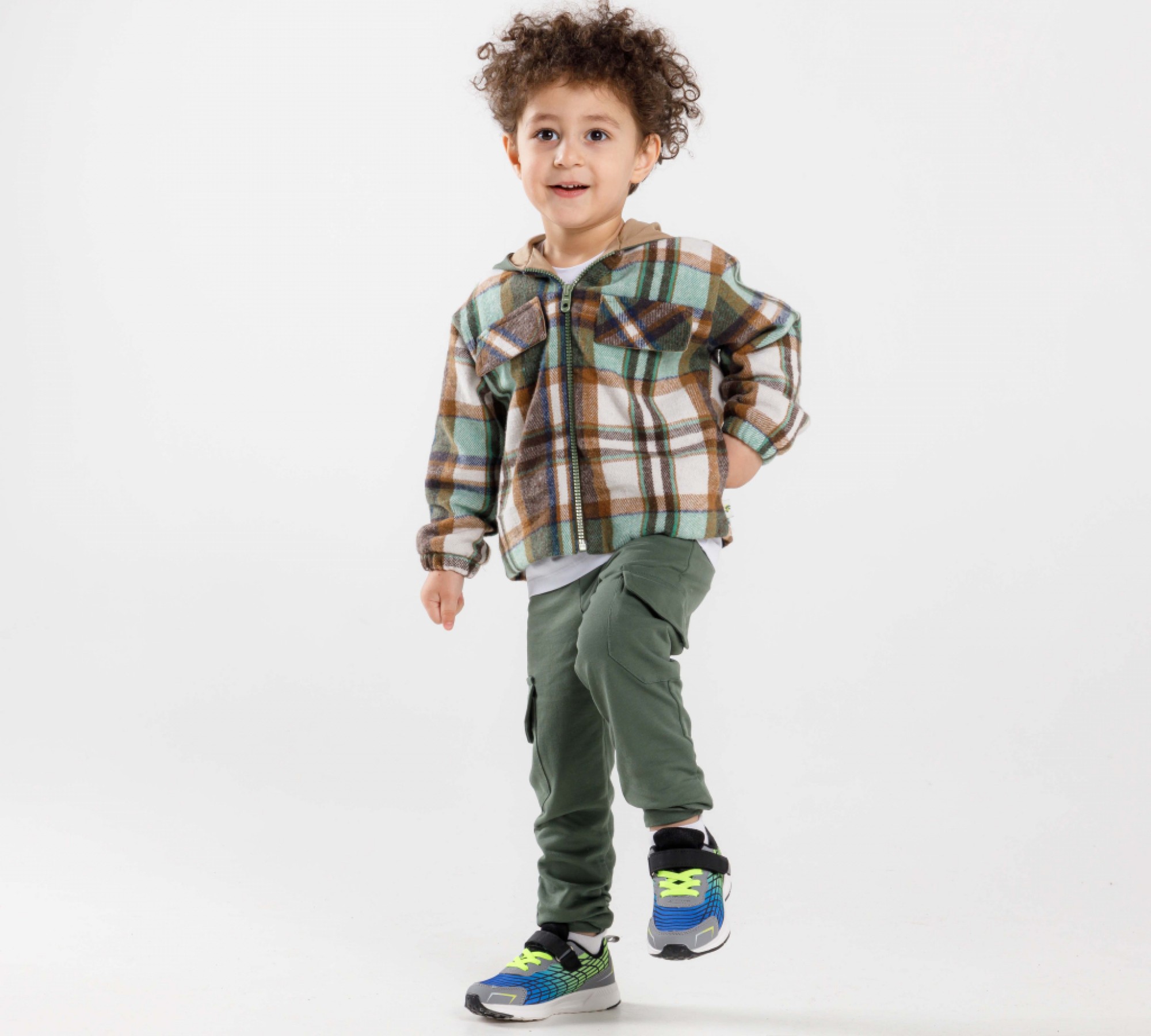 Этот клетчатый жакет коричнево-зеленого цвета с прикрепленным капюшоном и застежкой-молнией станет незаменимой вещью гардероба этого сезона. Стильный образ вашего ребёнка готов.