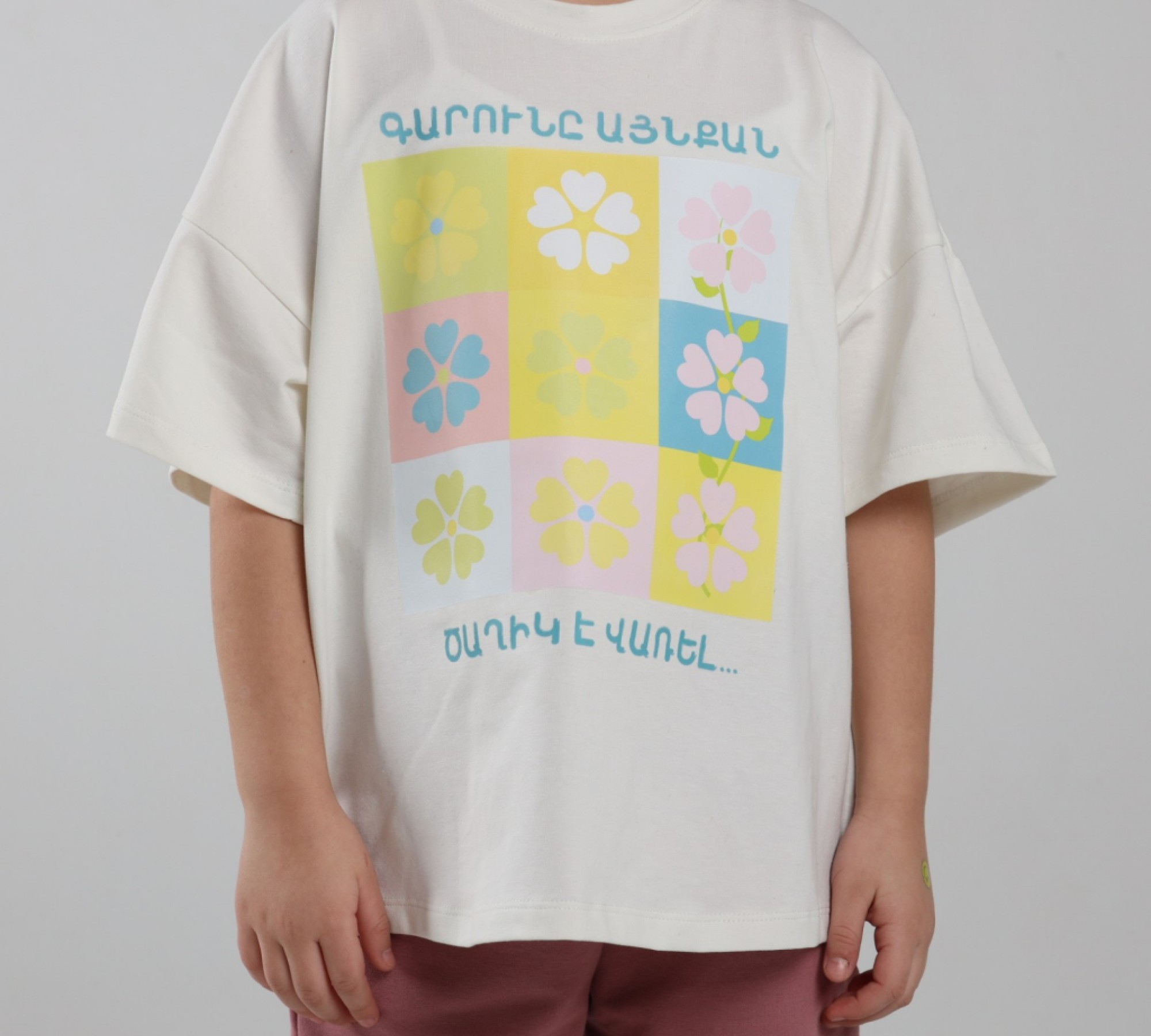Стильная, удобная и качественная футболка с короткими рукавами молочного цвета с ярким цветочным принтом и надписью \`Весна зажгла столько цветов\` для ярких девушек