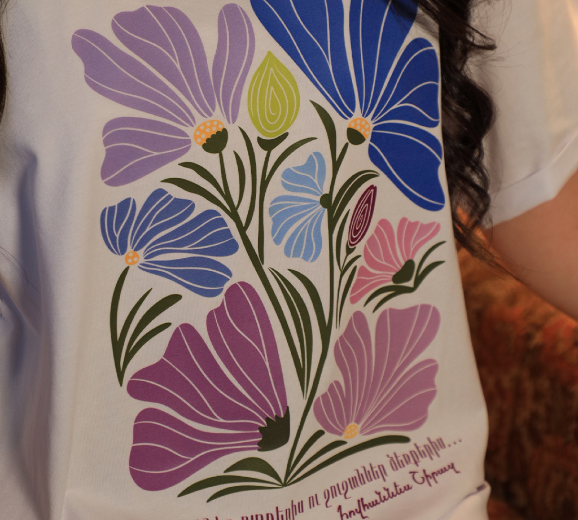Эта футболка вдохновлена красивыми строками из стихотворения Шираца «Приход весны», которые выражают глубокое сочетание любви и красоты. Футболка изображает нежный и яркий мир фиалок и лилий, создавая мягкое и трогательное настроение.