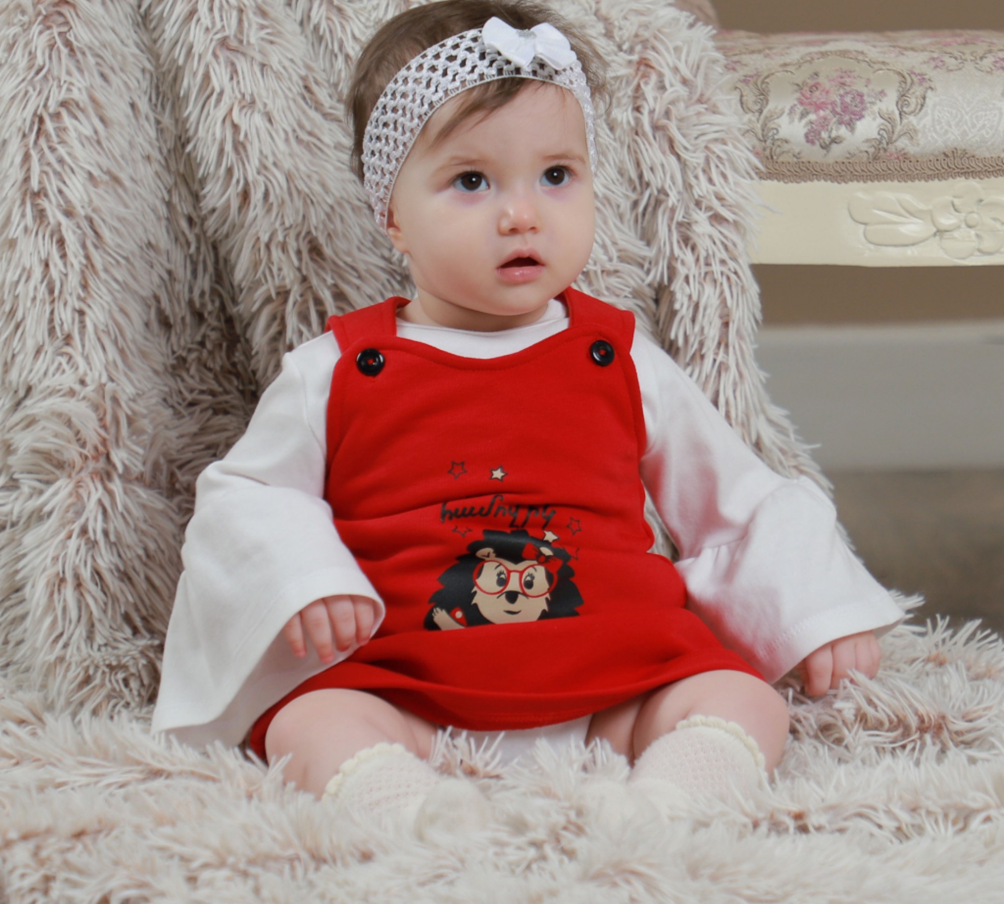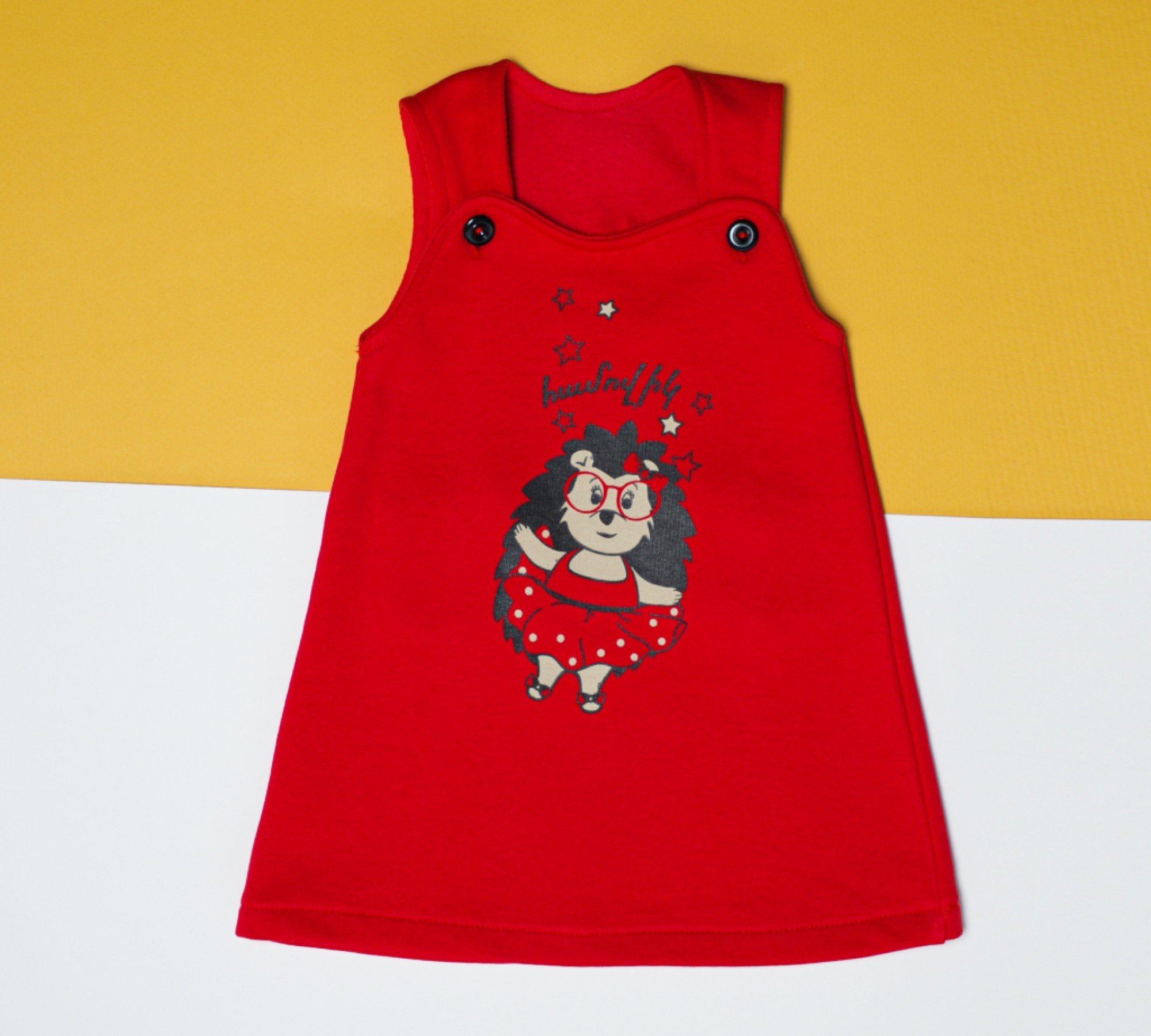 Стильный, удобный, качественный красный сарафан с принтом очаровательного ежика Лала для маленьких модниц