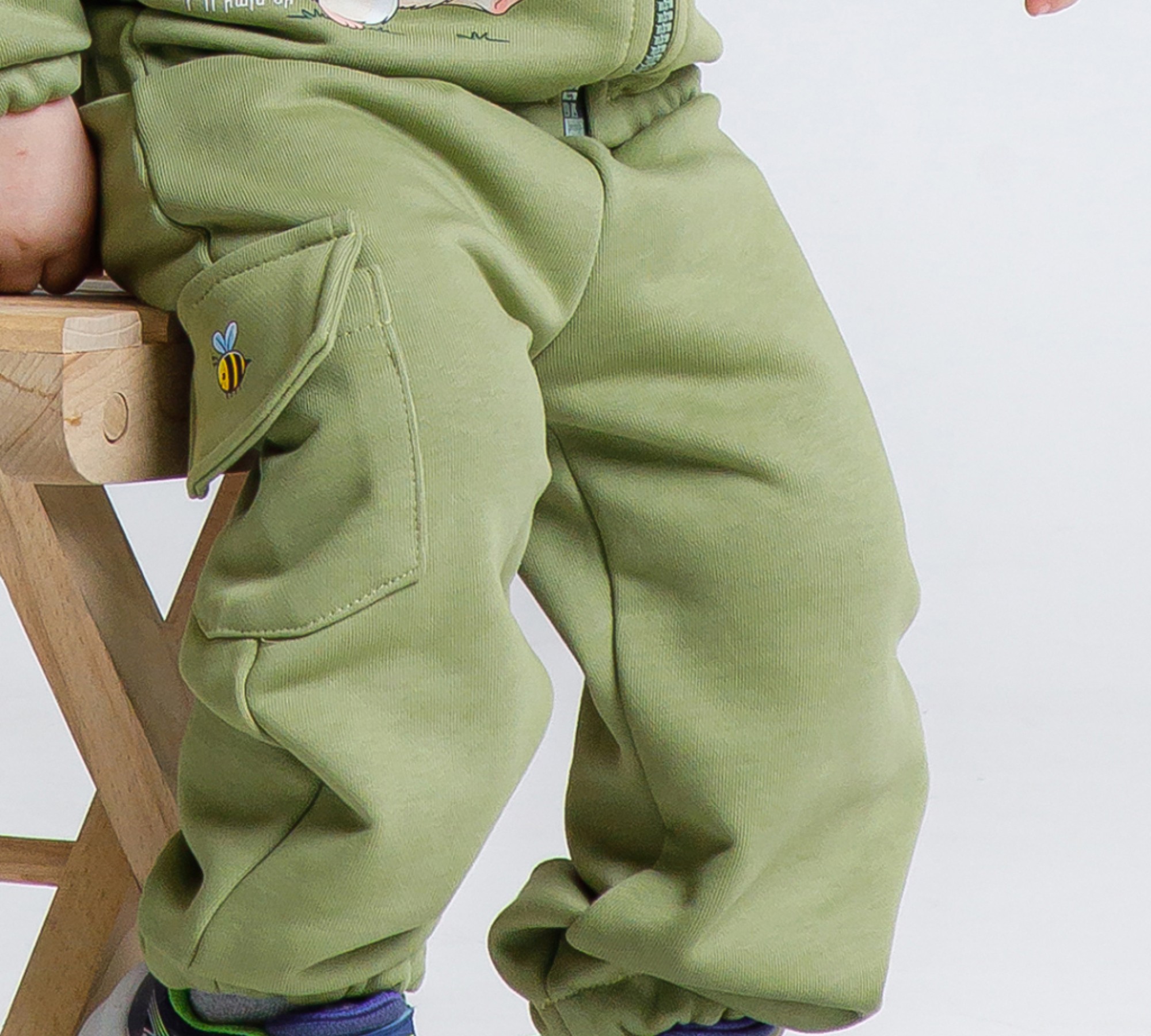 Брюки для малышей, изготовленные из высококачественного мягкого трикотажного полотна нежно-зеленого цвета. Принт с маленькой пчелкой подарит детям радостное настроение.