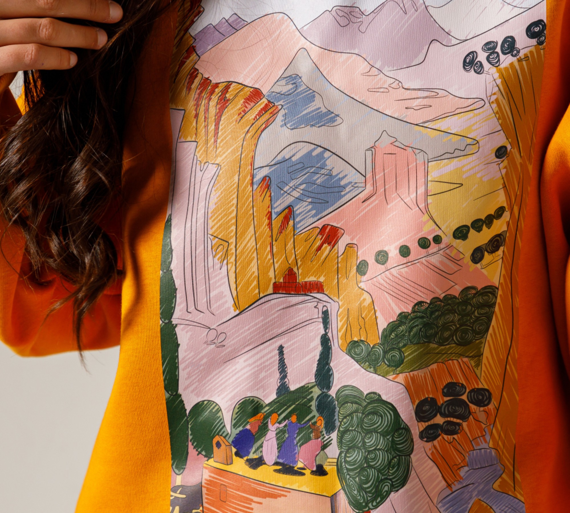 Стильный, качественный и уникальный свитер цвета охры с принтом мотивов знаменитого полотна `Армения` М. Сарьяна для девушек, ценящих родную природу.