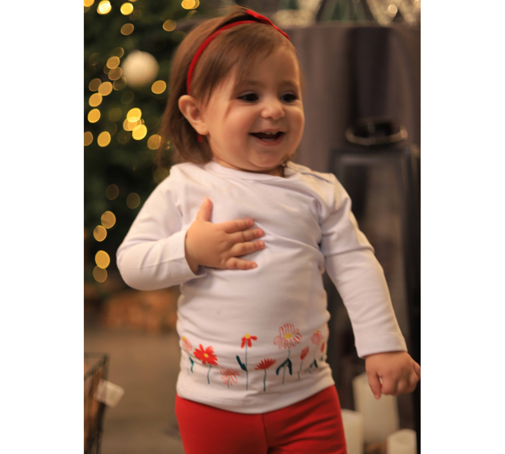 Своеобразная, стильная и качественная белая футболка с длинным рукавом с принтом ромашек и с кнопками на плече для маленьких модниц