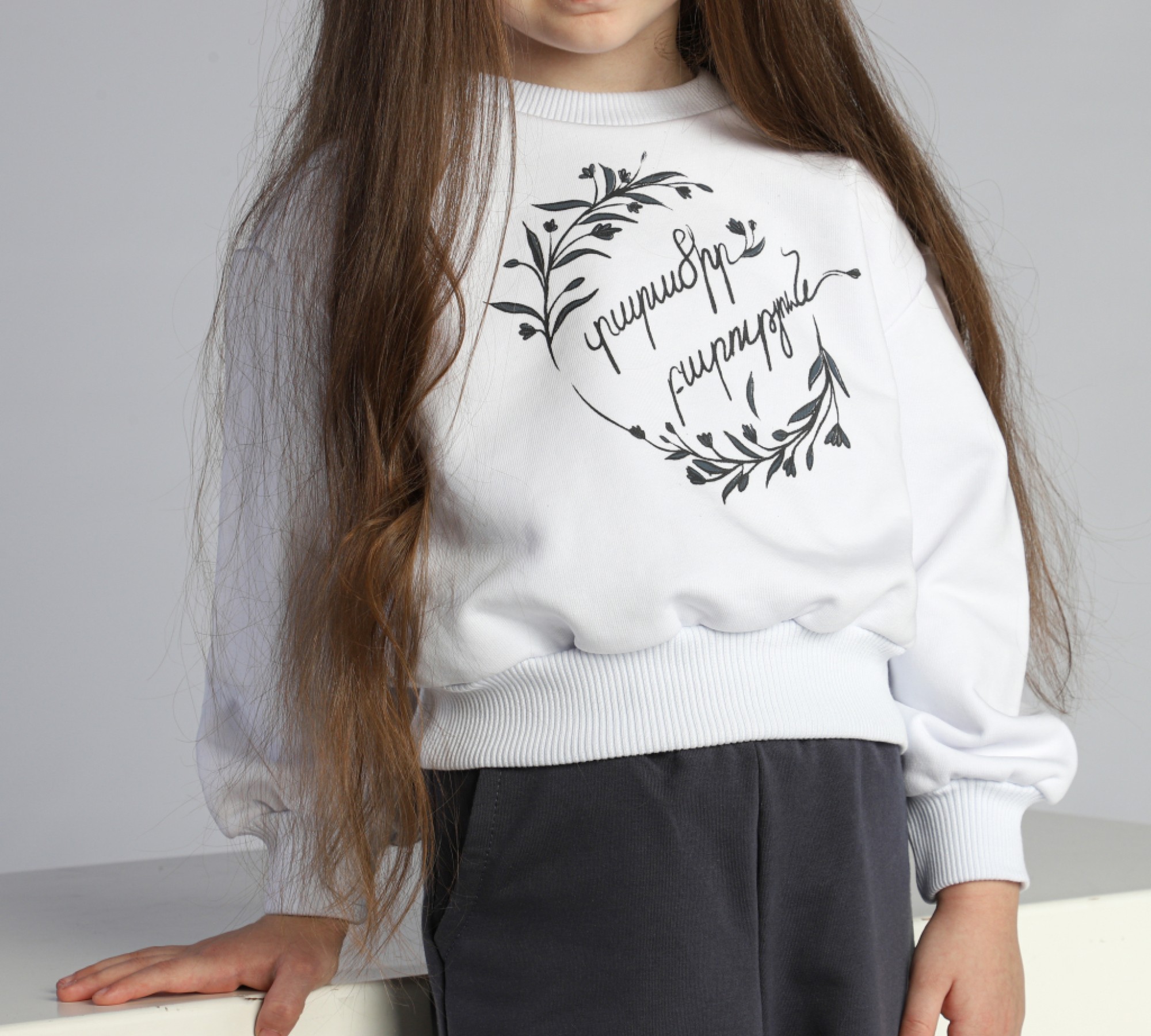 Стильный, качественный и удобный белый свитшот с надписью `Распространяй доброту` для девочек